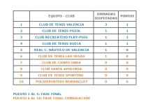 Tras haber finalizado la fase liga y conociendo todos los resultados disputados, el Club de Tenis El Puig ha quedado 1º en el Grupo Liga y Club de Tenis El Collao 1º en el Grupo Clubes.
